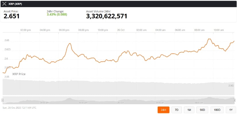 截至2025年10月27日,XRP现价徘徊于2.65美元附近,24小时涨幅达3.4%。经历数周剧烈波动后,当前稳定性暗示重大行情正在酝酿。今日XRP价格体现投资者信心,强劲的交易量为近期价格走势提供了支撑。