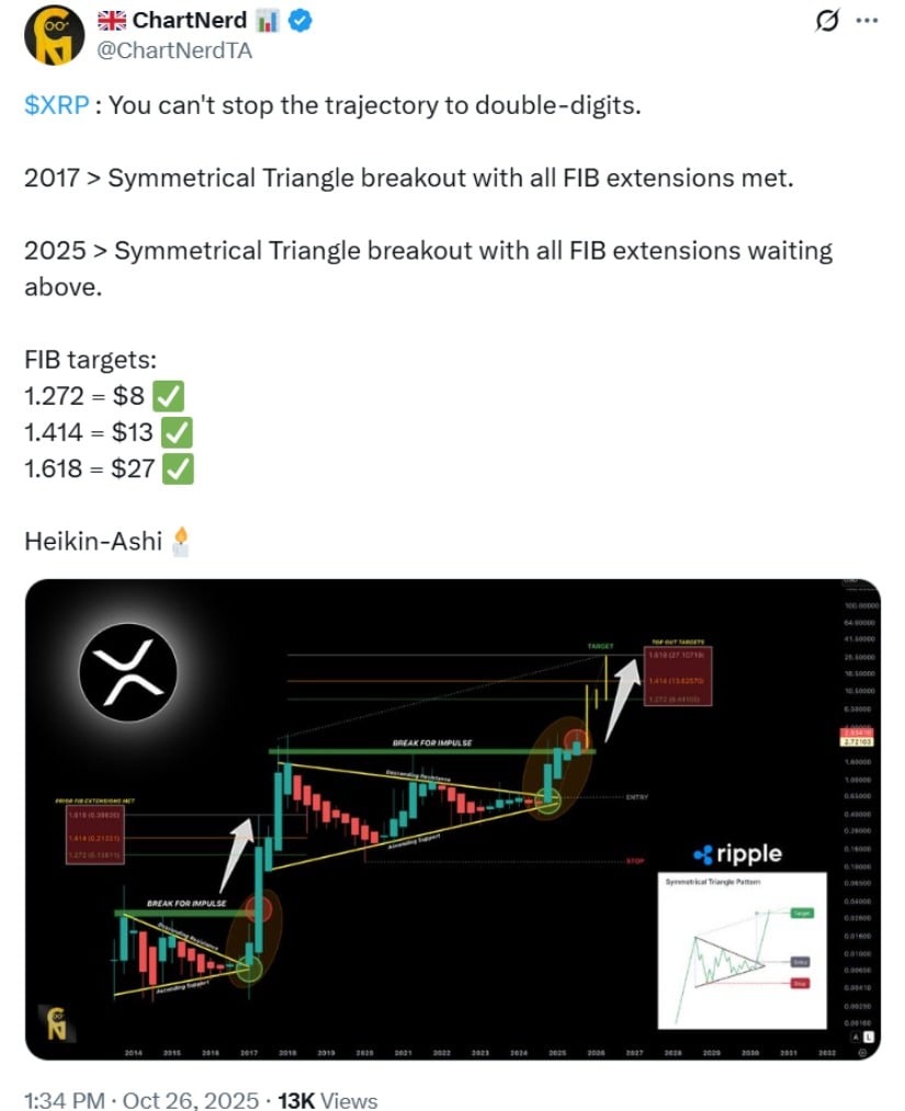 2025年XRP对称三角突破重现2017年走势,斐波那契目标位指向8美元、13美元和27美元。数据来源:@ChartNerdTA