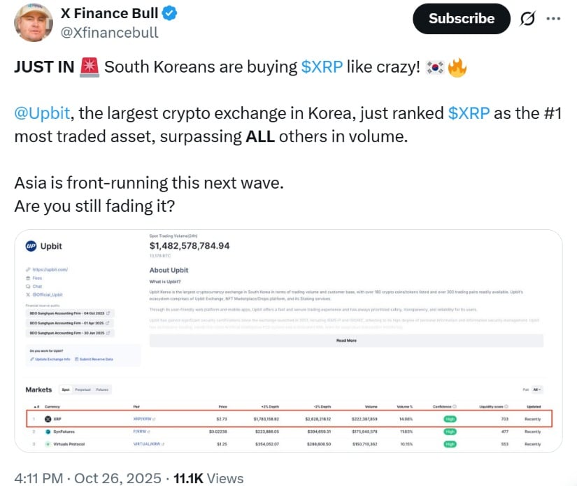 XRP在韩国Upbit交易所交易量超越所有加密货币登顶。数据来源:@Xfinancebull