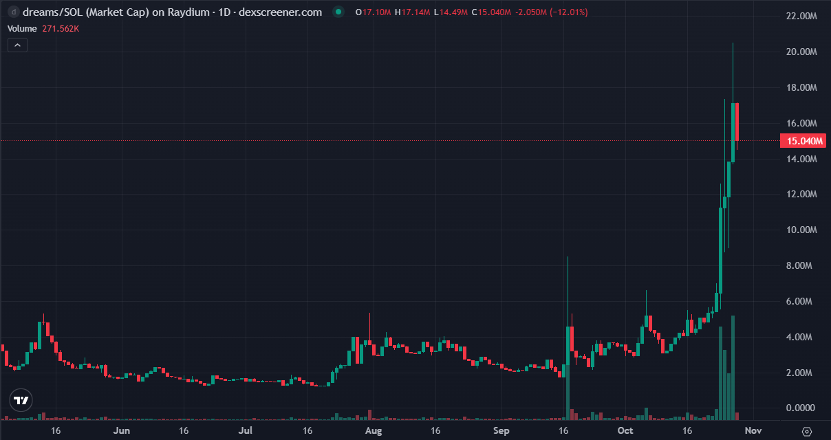 当前市值: DREAMS 市值昨日一度突破 2000 万美元,暂报 1500 万美元。