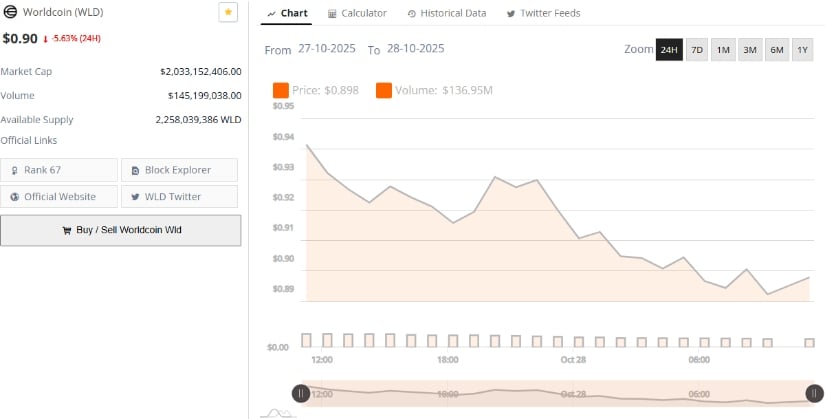 BraveNewCoin数据显示,Worldcoin现报0.90美元,24小时跌幅5.63%。该项目市值20.3亿美元,流通量22.5亿枚代币,24小时交易额1.451亿美元。尽管短期疲软,价格仍坚守局部支撑位,表明长期持有者持续活跃。