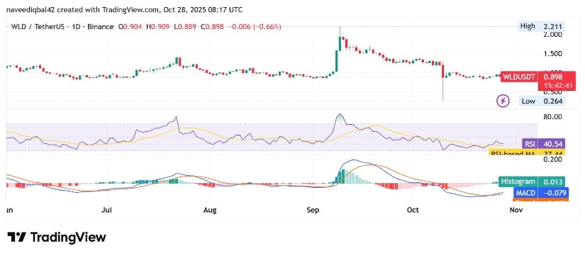 根据TradingView日线图,WLD/USDT现报0.898美元,日内跌幅0.66%。相对强弱指数(RSI)报40.54,自超卖区域小幅回升,表明卖压正在减弱。MACD指标现处-0.079,仍低于信号线,但柱状图正值(0.013)暗示早期动能复苏。