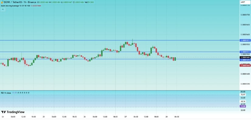 Bonk(BONK)在1小时下降通道内交易,0.00001425美元处获支撑,目标突破0.00001476-0.00001571美元区间(需严格风险管理)。来源:CryptoAnalystSig