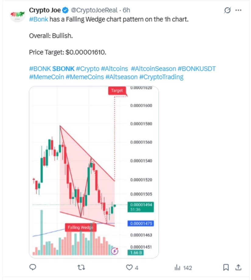 Bonk(BONK)1小时图呈现看涨下降楔形形态,目标价位0.00001610美元。来源:Crypto Joe via X