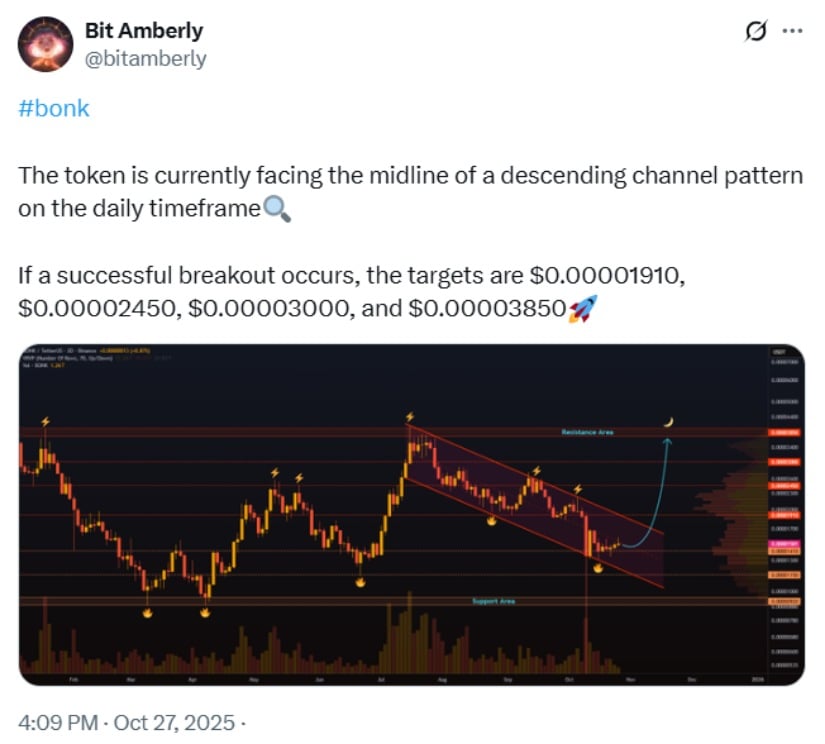 Bonk(BONK)正在测试日线下降通道中轨,突破后目标区间0.00001910-0.00003850美元。来源:Bit Amberly via X