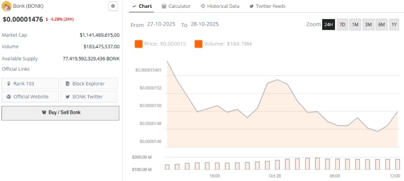 截至2025年10月28日,Bonk交易价格约为0.0000148美元,过去24小时微跌0.38%。尽管如此,交易量暴涨近88%至1.95-1.96亿美元,显示投资者活跃度提升。过去一周Bonk温和上涨1.34%,表明交易所正逐步吸筹。