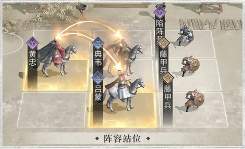 站位:布阵站位时,应注意让黄忠踩在典韦后方的追击格上,同时吕蒙和典韦站在同一排,提供的追击格也覆盖到黄忠。