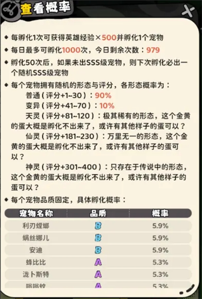 4、孵化机(抽卡)只能抽到普通和变异两种形态的宠物,前期可以适当抽取变异SSS宠物,资质最高。后期只需要用获取的免费抽卡券抽即可。