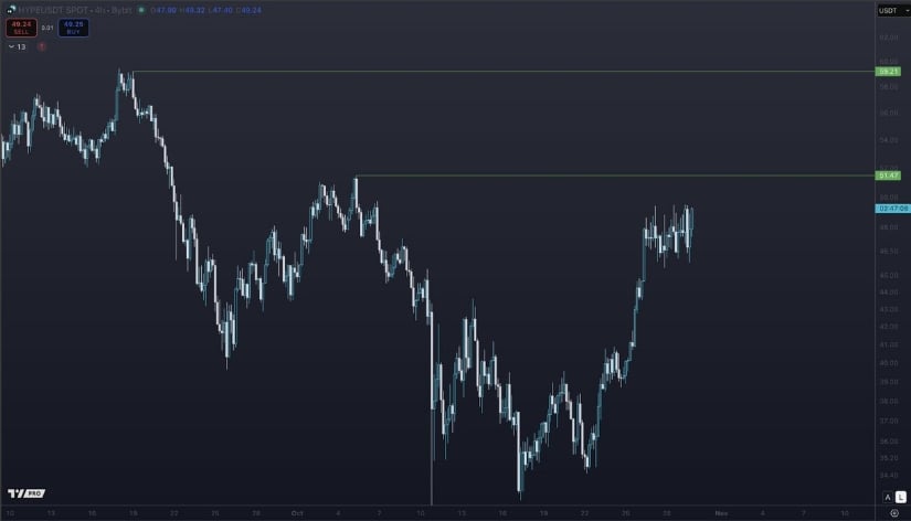 Hyperliquid现已从近期低点完全恢复,正在更高时间框架阻力下方整固——该水平曾压制今年多次上涨。48至50美元之间的水平区域被视为"成败关键区",买方正尝试在下一波上涨前吸收卖盘。
