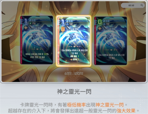 然后这个游戏还存在神之灵光一闪(后面简称神闪),一般被神闪的卡效果都会比其他的卡强力,但这是极小概率事件,因此真的相当看运气。