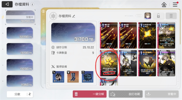 目前可以确定的就是,辅助不打伤害的话,不要穿武器,主C一律不穿防具,这样可以让装备占的TB分变少,就可以多带一个神闪,或者多删几张卡出来了。