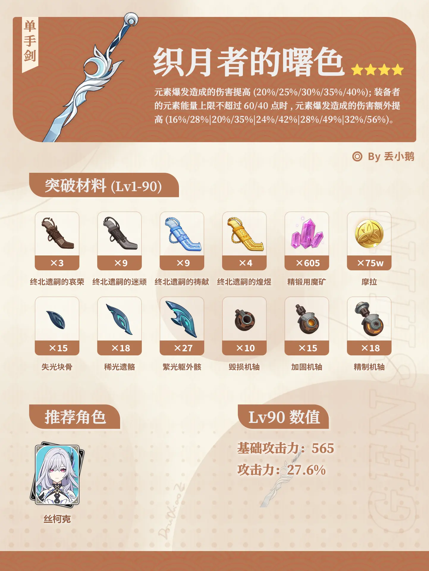 终北选嗣的哀荣×3、终北遗嗣的迷顽×9、终北遗嗣的祷献×9、终北遗嗣的煌煜×4、失光块骨×15、稀光遗路×18、繁光躯外骸×27、毁损机轴×10、加固机轴×15、精制机轴×18