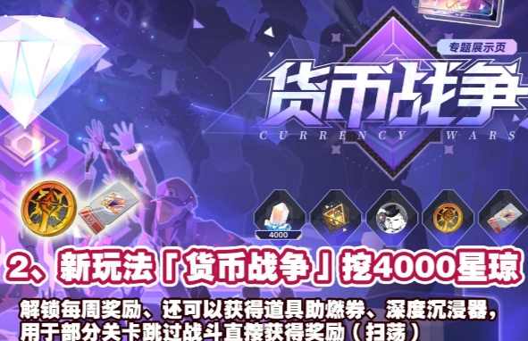 2、新玩法「货币战争」中有4000星琼可挖,但是全拿完需要一定时间,首周要做的是起码把教程过了,解锁每周奖励,并拿到本周的奖励(因为下周就会刷新新的奖励了,像目前的模拟宇宙周常奖励一样),后续时间充裕的可以挖一下这4000星琼。