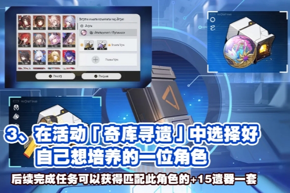 3、新活动「奇库寻遗」中,可以选择一位角色,通过后续的日常活跃任务,获得一套匹配这位角色各部位主词条的+15的遗器,所以记得提前从这里选好要培养的角色。