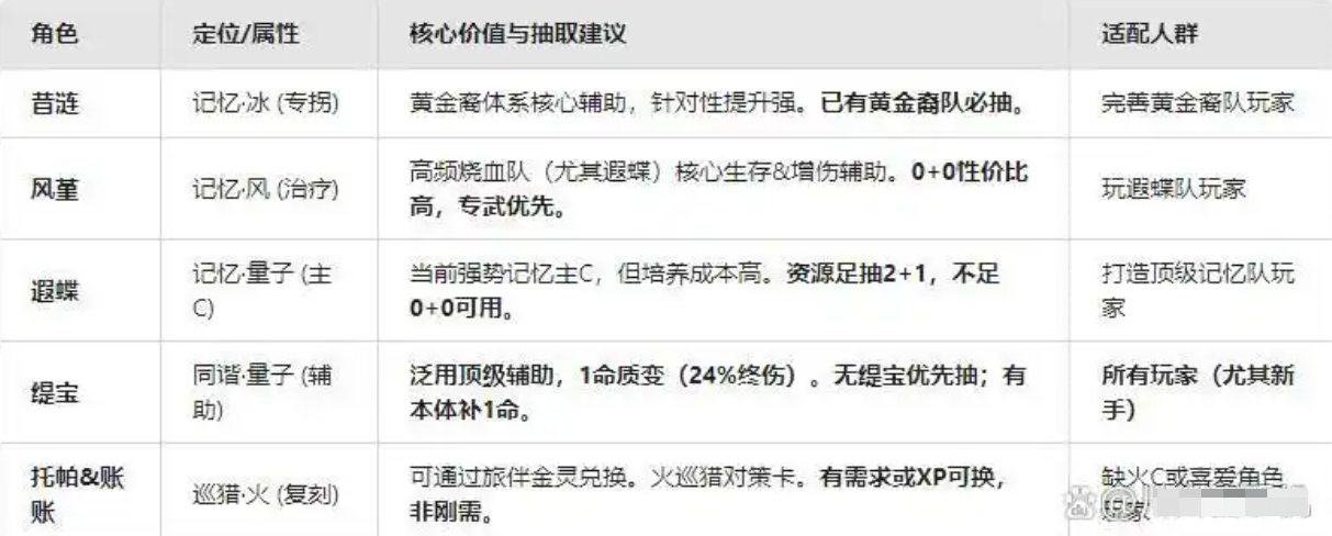 老玩家:根据队伍短板补强:缺遐蝶队核心辅助抽风堇;完善黄金裔体系抽昔涟;补强主C抽遐蝶;提升泛用性抽缇宝星魂。