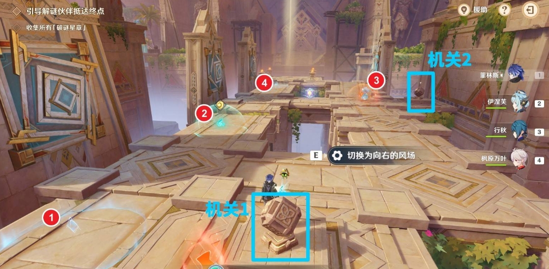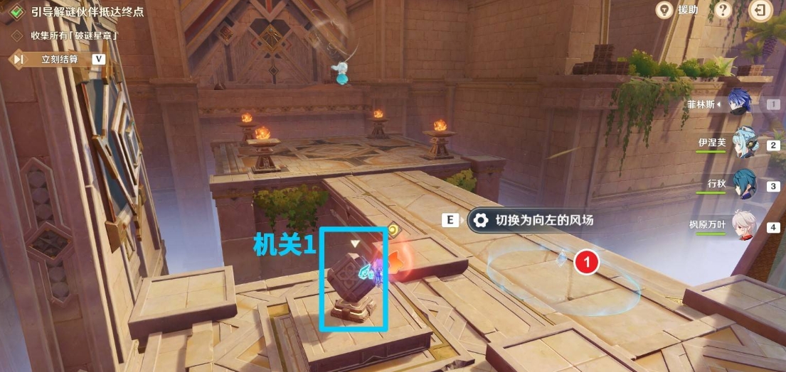 首先在珐露珊解谜伙伴刚出场时与风场机关互动一次,关闭珐露珊右侧(下图左侧)的风场。