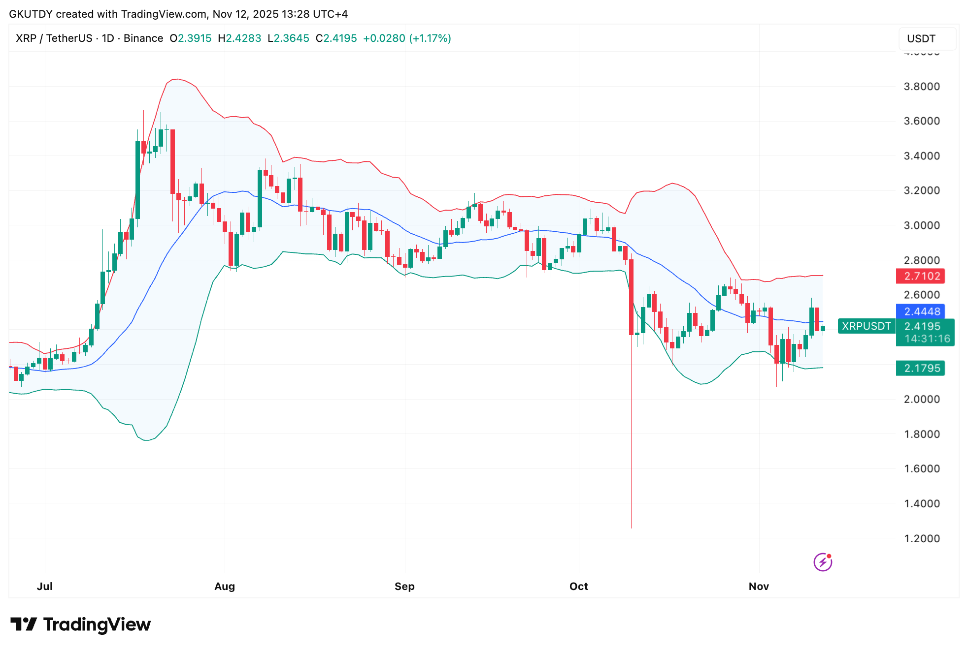 热门加密货币XRP横盘于2.40美元附近,尽管多支相关ETF预计本周开始交易,但布林带指标显示其面临技术压力,该区间突破往往伴随剧烈波动。日线和周线指标表明,买家正在2.40-2.50美元阻力位丧失控制力。