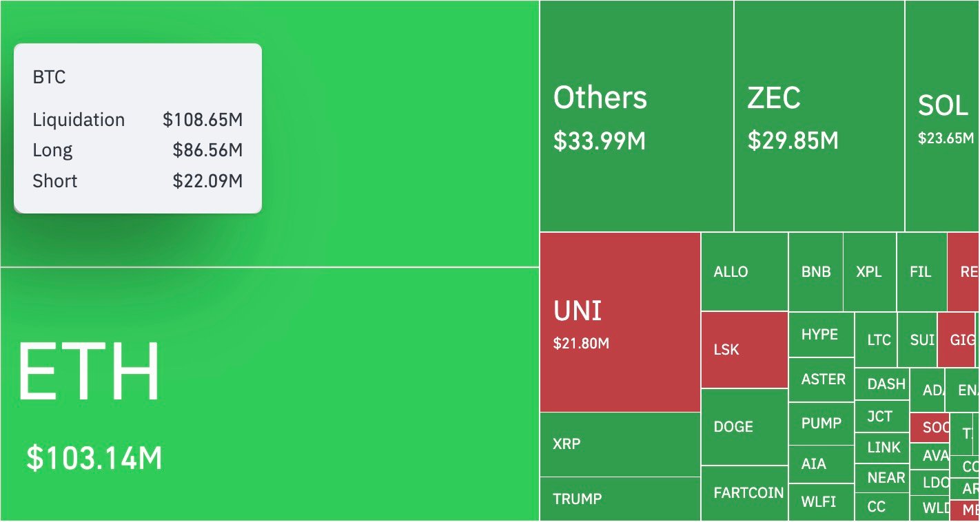 CoinGlass数据显示,过去24小时清算总额4.0813亿美元,其中多头清算3.2126亿,空头仅8687万,多空比达4:1。比特币单独贡献1.0865亿亏损(多头8656万/空头2209万),以太坊清算1.03亿,ZEC和SOL分别清算2980万和2360万。