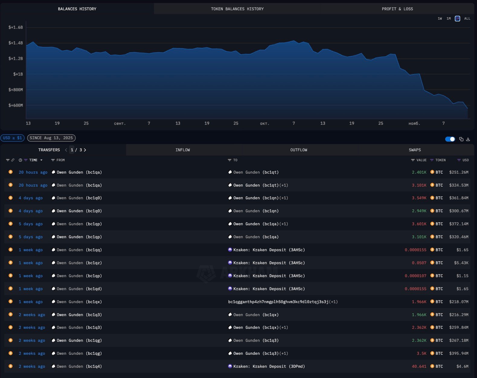 Arkham追踪显示,早期矿工Owen Gunden出售了约5,350枚长期休眠的BTC(现价约15亿美元)。过去两周这些资产被分批转移至Kraken交易所和多个场外交易柜台。