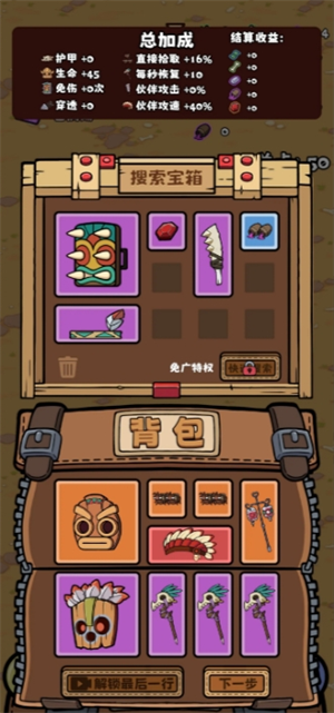 第一关结束看一次广告激活背包第四行,后续多带两件装备可增加容错率。