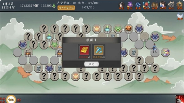 打开宝库,奖励:星石碎片*3,灵血丹*2,罗刹炼狱甲(衣服,需神话赋予,无羁绊角色用),银两*10000