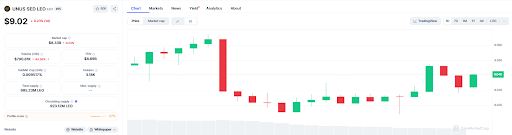 2025年7月数据显示,LEO价格稳定在9.02美元水平,市值突破83.4亿美元跻身全球前20。相比历史低点0.8036美元已实现1024%涨幅,日交易量79.2万美元反映市场活跃度适中。在整体加密市场3.33万亿美元规模的背景下,LEO凭借持续代币销毁机制保持稳健发展态势。