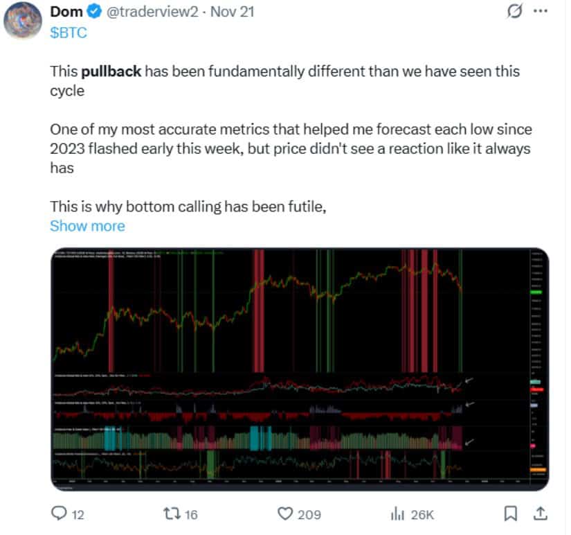 本轮回调颇为反常——可靠的低点预测指标虽提前发出信号,但币价未如期响应,使得抄底难度增加。来源:Dom via X