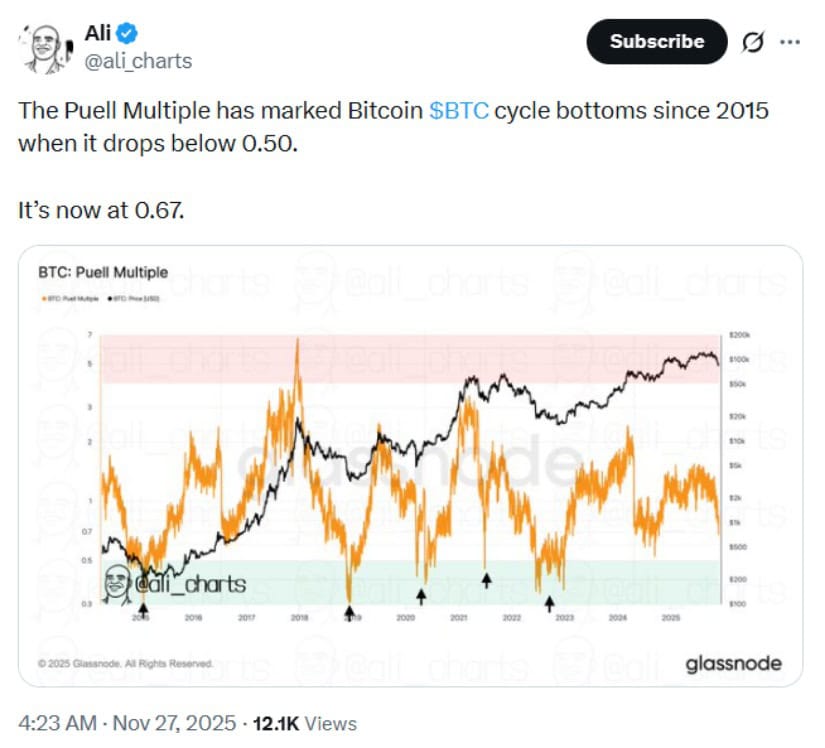 以周期指标分析闻名的链上专家Ali指出:"Puell倍数进入折价区表明比特币可能被低估,暗示中期或反弹至96,000美元。"