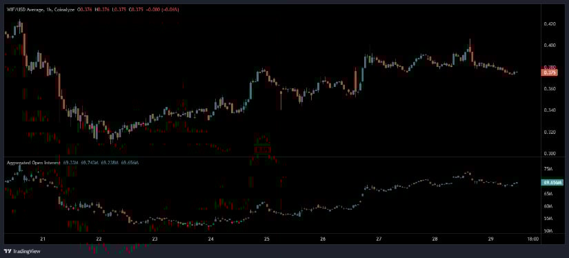 BraveNewCoin数据显示Dogwifhat当前交易价格为0.38美元,对应市值379,928,401美元,日交易量128,530,337美元。过去24小时跌幅0.78%,但仍稳居加密货币前200名,现排名191位,流通供应量998,926,392枚。