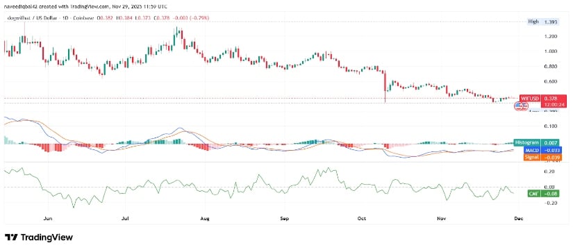 小时图显示WIF在11月21-23日期间形成上升趋势,构筑出清晰的高点与低点同步上移结构,标志着对早期抛压的强劲反弹。这一复苏态势持续至27日左右,随后市场开始伴随系列温和回调进入横盘。这种蜡烛线收窄与方向性运动减弱的组合,正是脉冲式反弹后典型的盘整阶段特征。