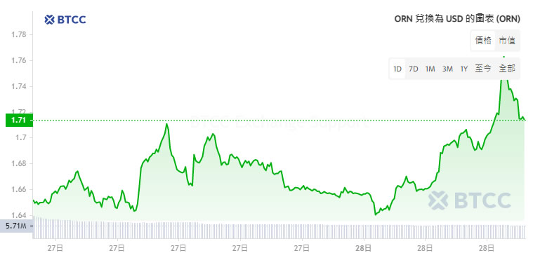 ORN在2021年3月创下29.29美元历史峰值,随后经历长达两年的熊市调整。2024年市场回暖期间最高反弹至2.77美元,当前报0.3643美元。其价格波动性显著,24小时交易量达20,000美元。