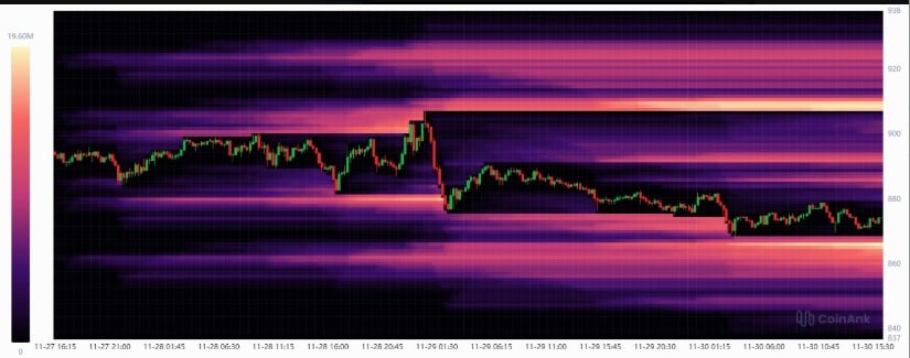 这些高位流动性池的形成引起了市场观察者的关注。价格在这些密集带下方的压缩状态,通常被视为强势波动的先兆。图表活动反映出卖压与空头头寸在909美元这个明确阈值交汇,该区域可能引发市场的快速仓位重组。
