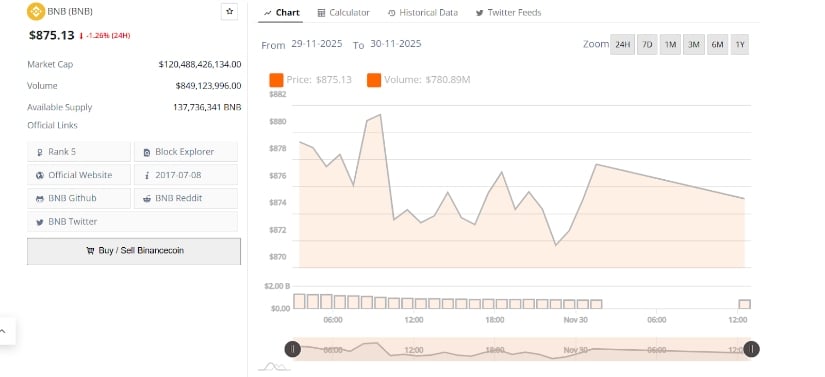 24小时图表显示币安币交易区间约为872-880美元,日内波动有限。短暂下探后虽尝试反弹,但未能维持上行动能。每次上行都遭遇温和阻力,形成渐低的峰值和短暂回撤。这种走势反映市场正处于买卖双方均未取得绝对控制的阶段。