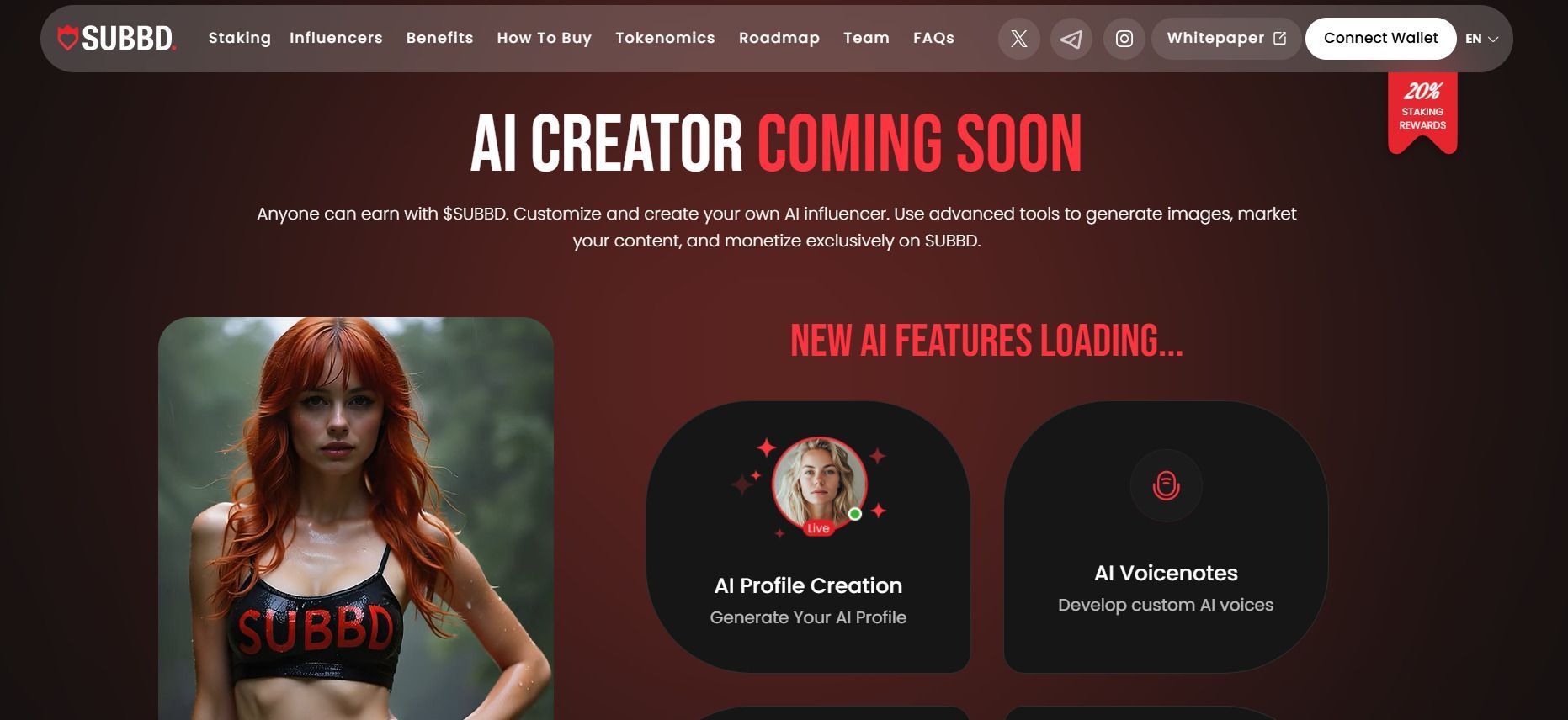 作为内容创作行业的革新者,$SUBBD采用10亿枚固定供应量设计,其中30%将直接注入创作者基金和生态系统建设。该代币不仅支持订阅付费、NFT内容解锁等基础功能,更通过AI数字形象定制和24/7智能互动等创新服务重塑行业标准。