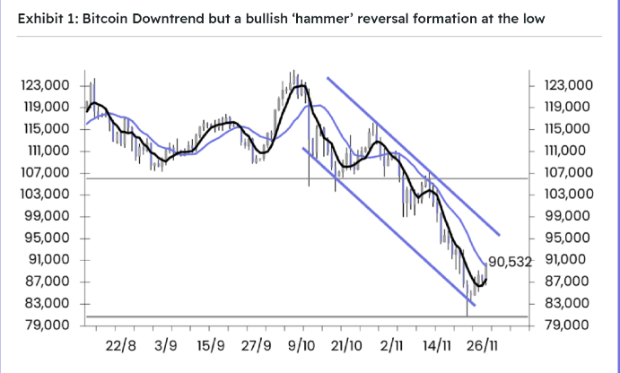 当比特币短暂触及8万美元区域时,形成了看涨锤形反转形态,部分交易者期待假日季行情启动。