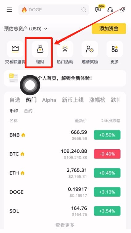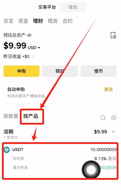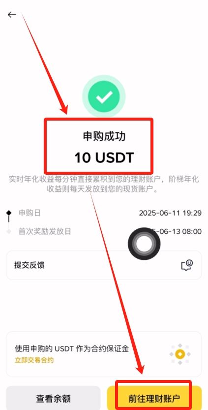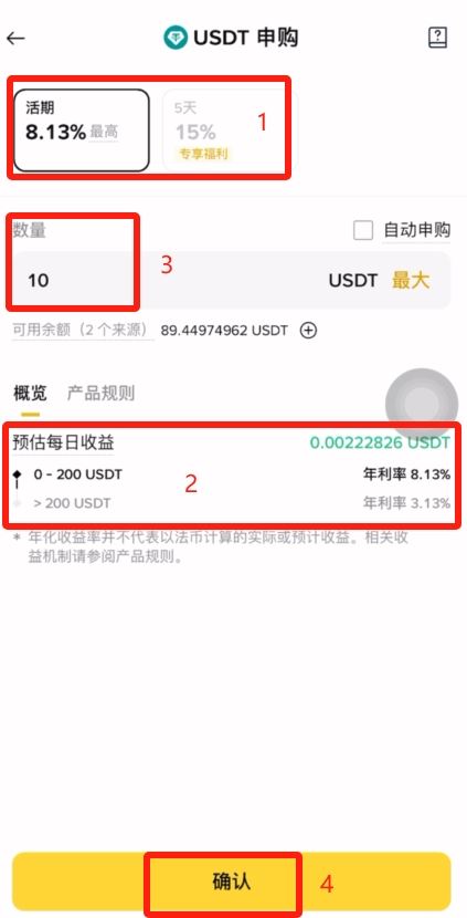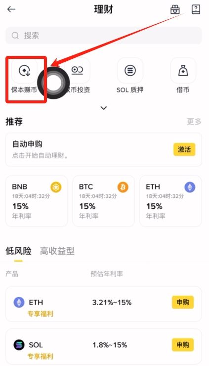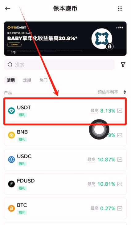 完成注册及KYC认证后,登录币安APP点击顶部【理财】入口。在【保本赚币】专区选择USDT产品,活期收益最高可达8.13%。输入申购数量确认后,系统将自动计算每日预估收益。
