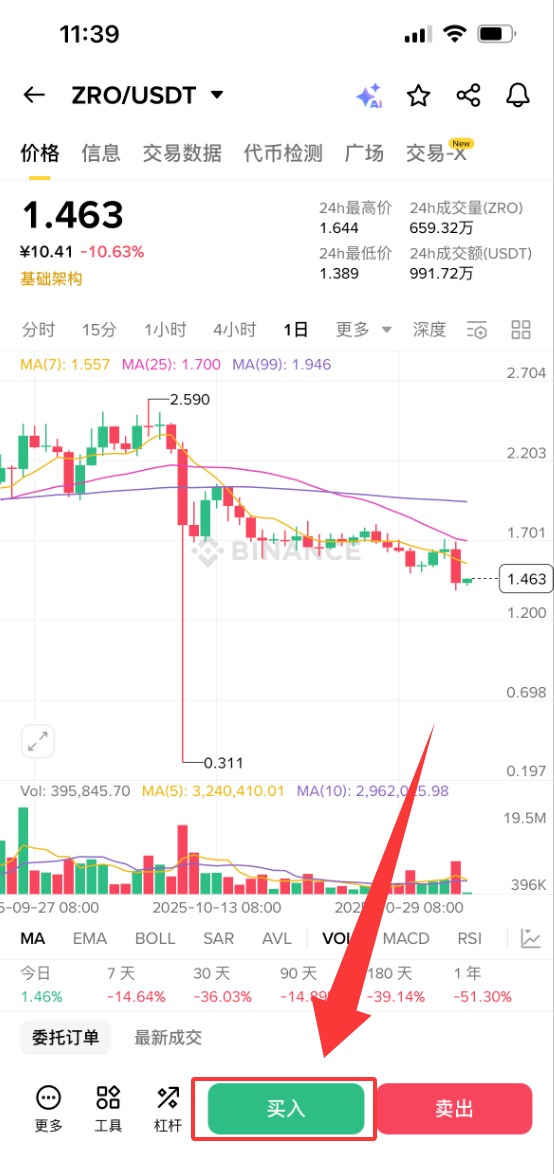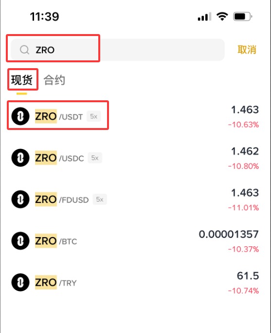 输入【ZRO】,选择【现货】【ZRO/USDT】交易对(新手建议从现货交易开始)