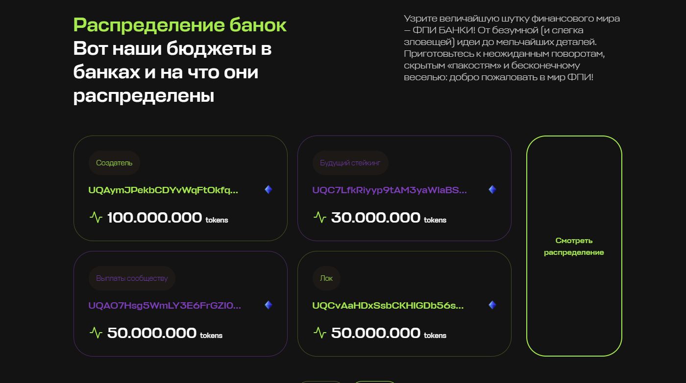 FPIBANK最初是作为幽默项目"Fufelshmirtz Mischief Incorporated"的一部分而诞生,其设计灵感源于对传统经济机构的趣味性模仿。代币总量为10亿单位,分配明确:1亿归创建者,5000万用于社区预留,3000万用于质押,另有4000万计划销毁。