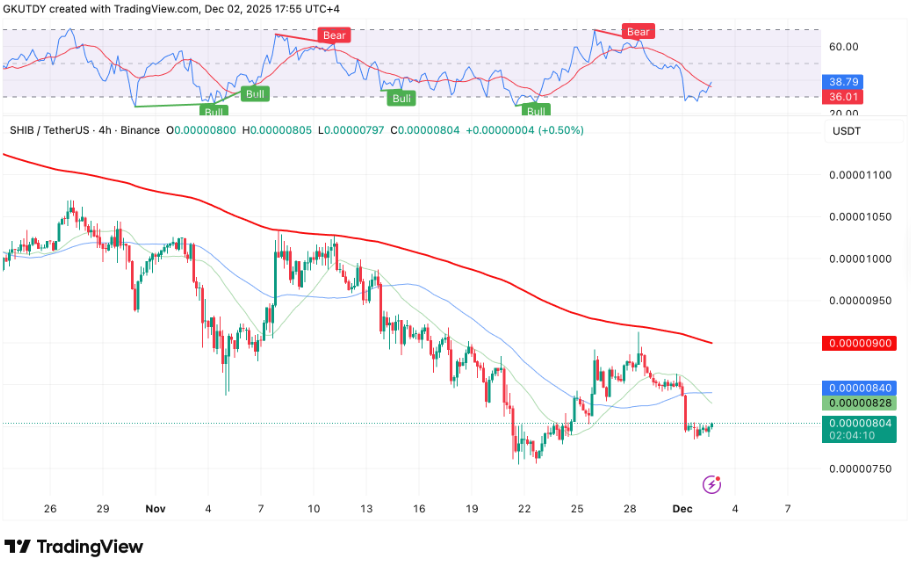 最新价格分析证实,柴犬币在12月2日闪现看跌信号。具体表现为4小时周期图表上出现死亡交叉——50周期简单移动平均线(SMA)上穿23周期SMA,预示该模因币将面临新一轮看跌压力。