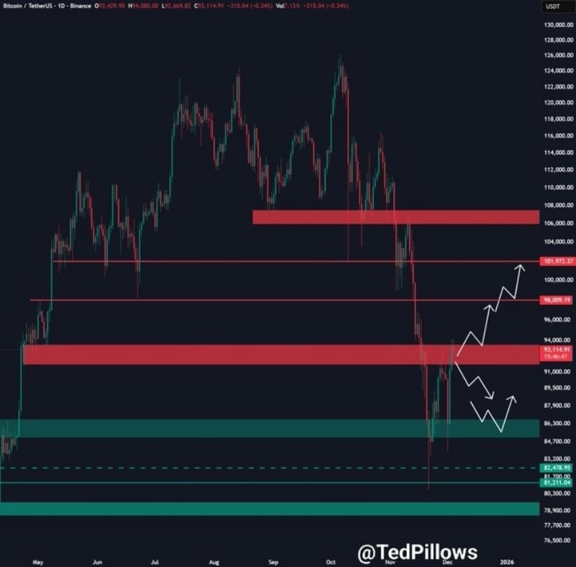 市场情绪保持谨慎,因BTC当前所处区域在过去两周内多次引发价格反转。分析师Ted(@TedPillows)指出:"比特币仍受困于93,000-94,000美元区间。收复该关口将为冲击10万美元打开通道,而若遭拒绝可能推动比特币跌至90,000美元下方。"