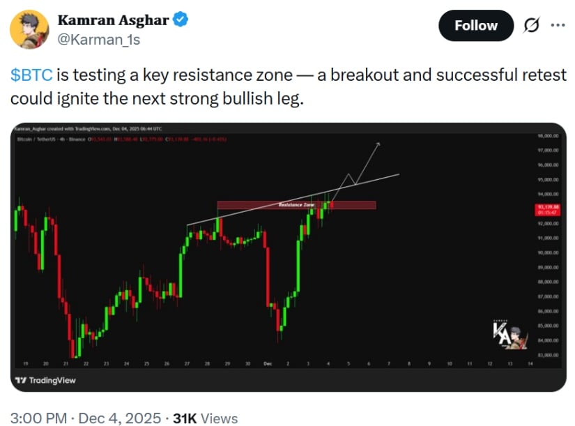 分析师Kamran Asghar(@Karman_1s)阐释该阻力区意义:"比特币正在测试关键阻力带——有效突破并成功回踩可能引爆下一轮强劲上涨。"
