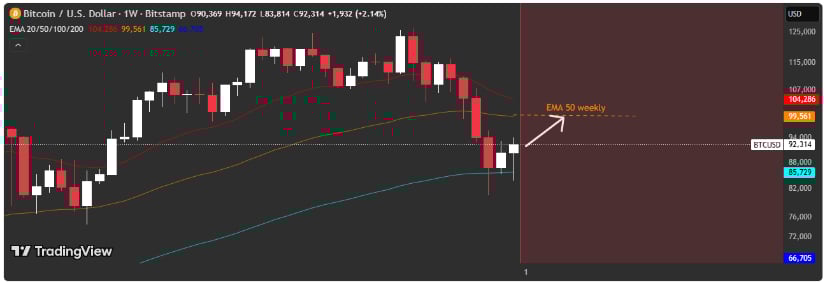 比特币徘徊于关键的50周EMA均线附近,若遭拒可能跌至85-92K美元区间,而突破则有望推动价格冲击120-128K美元。来源:Tradingview上的FlorinCharts