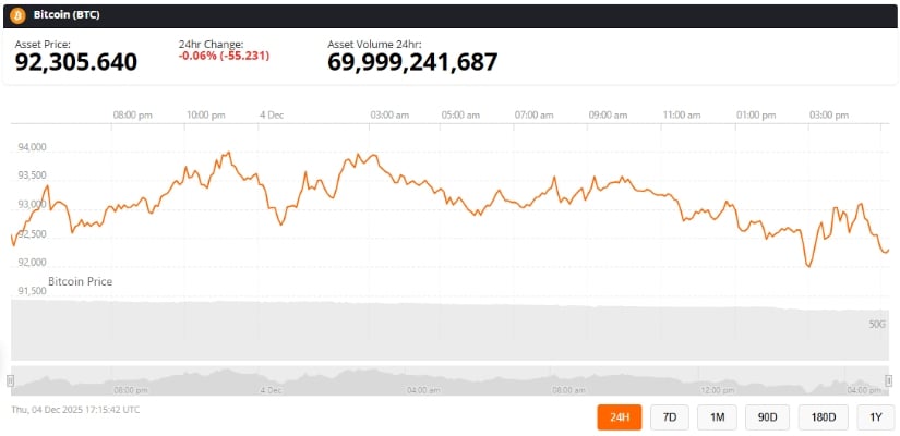 比特币(BTC)持续在93,000-94,000美元阻力带下方徘徊,该区域被交易者普遍视为市场重要决策点。Brave New Coin数据显示,比特币现报92,305美元,24小时微跌0.06%,而日交易量仍维持在近700亿美元高位。