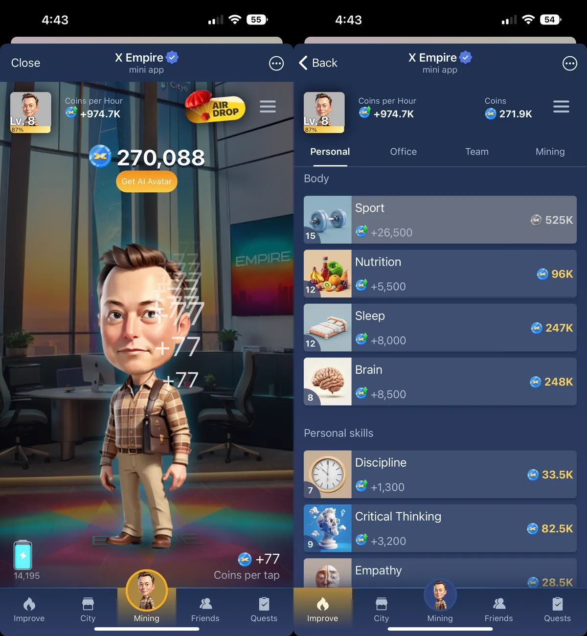 X Empire最初以"Musk Empire"名称在平台推出,三个月内吸引4700万玩家。这款基于TON区块链的点击赚钱游戏,通过简单的点击机制让玩家赚取游戏代币,并升级角色属性提升收益。