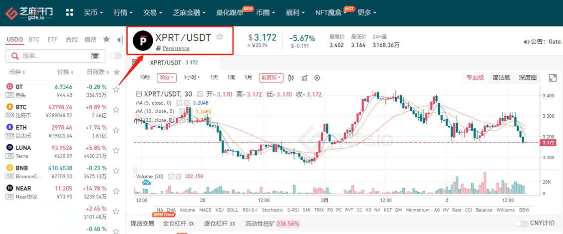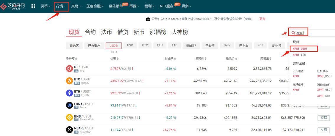 2.进入行情页面搜索XPRT,选择XPRT/USDT交易对