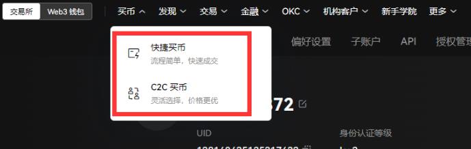 2.导航至【买币】板块,选择快捷买币或C2C交易模式