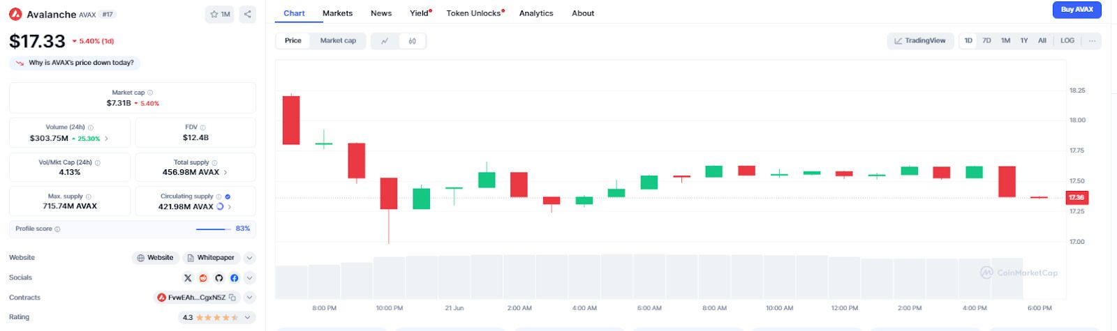 最新行情显示AVAX报价17.35美元,市值73.2亿美元位列加密货币第17位。24小时交易量达3.0268亿美元,但短期呈现2.36%跌幅。历史峰值144.96美元(2021年)与13美元低谷(2022年)形成鲜明对比,2024年价格区间回升至20-55美元。