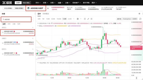 5、搜索AIDOGE币,选择AIDOGE/USDT交易对查看实时行情