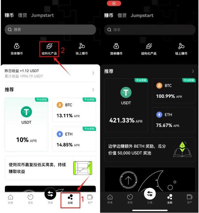 1、打开OKX App,底部导航选择【经济】进入经济页面,点击【结构化产品】后,选择【海鸥】