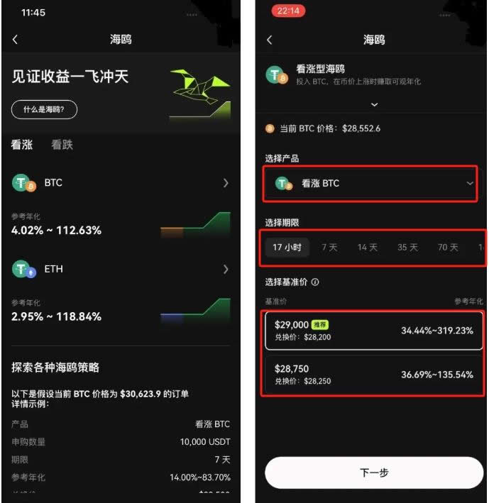 2、先选择方向【看涨/看跌】,然后选择标的币种【BTC/ETH】,最后选择【期限】以及相关的【目标价格,包括基准价和兑换价】
